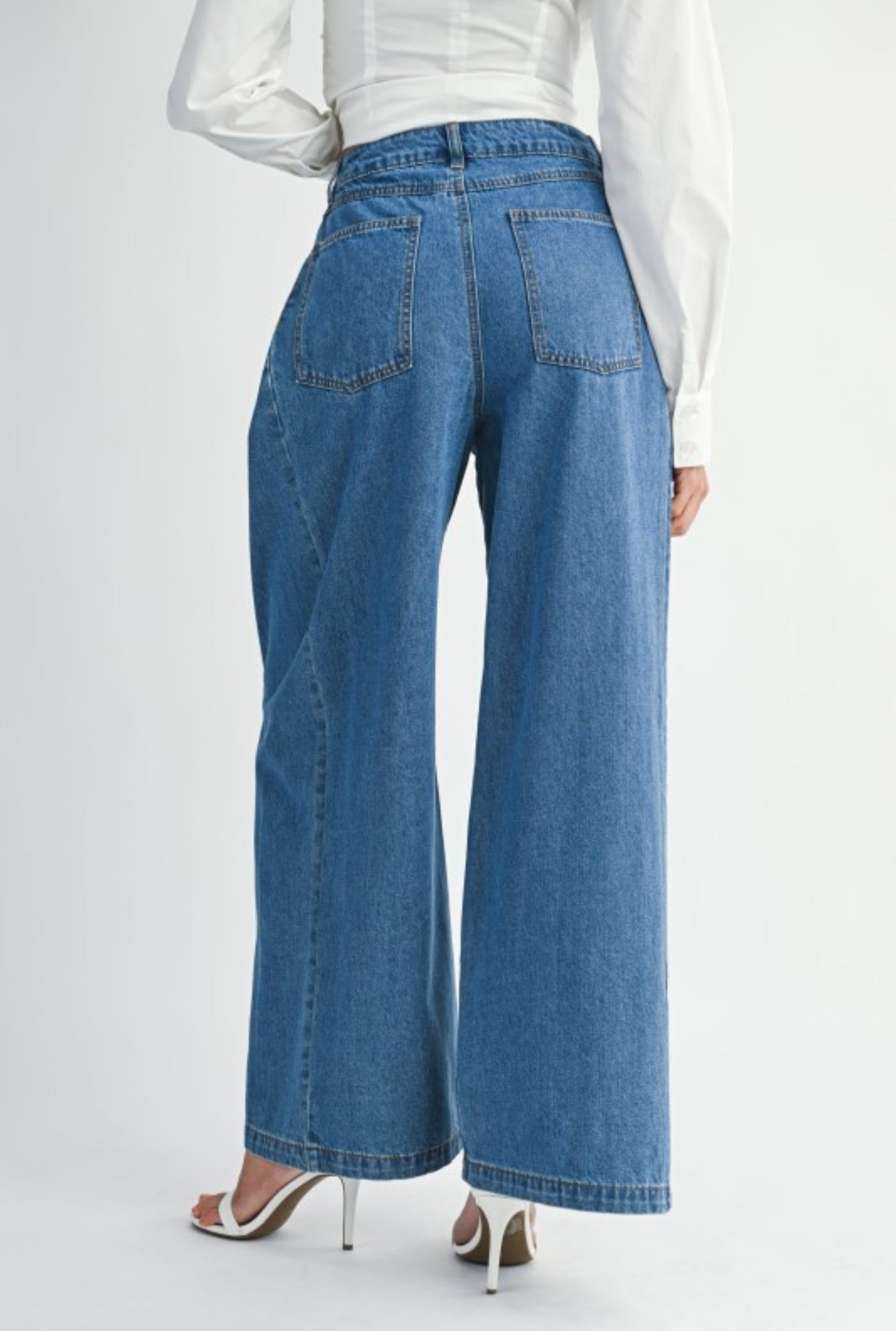 High waisted denim side pleated detail wide leg jeans with front buttonclosure.85% COTTON 15% POLYESTER