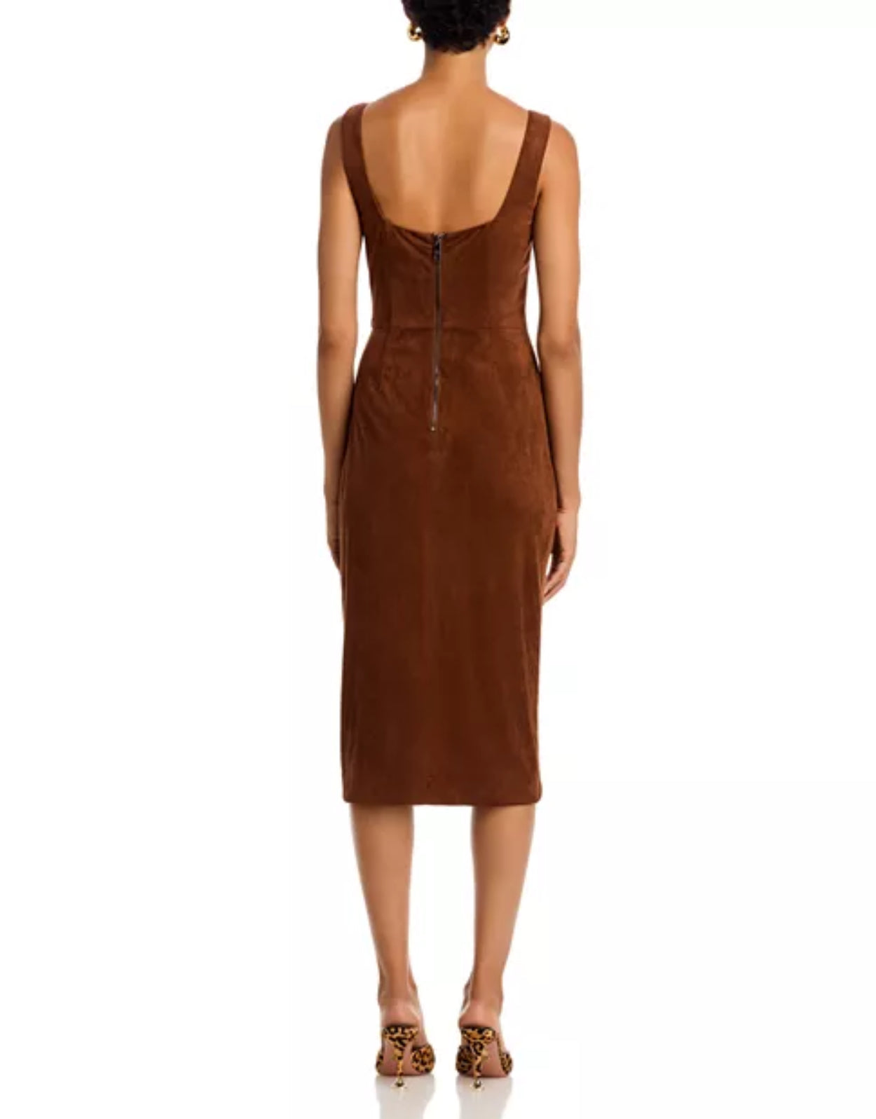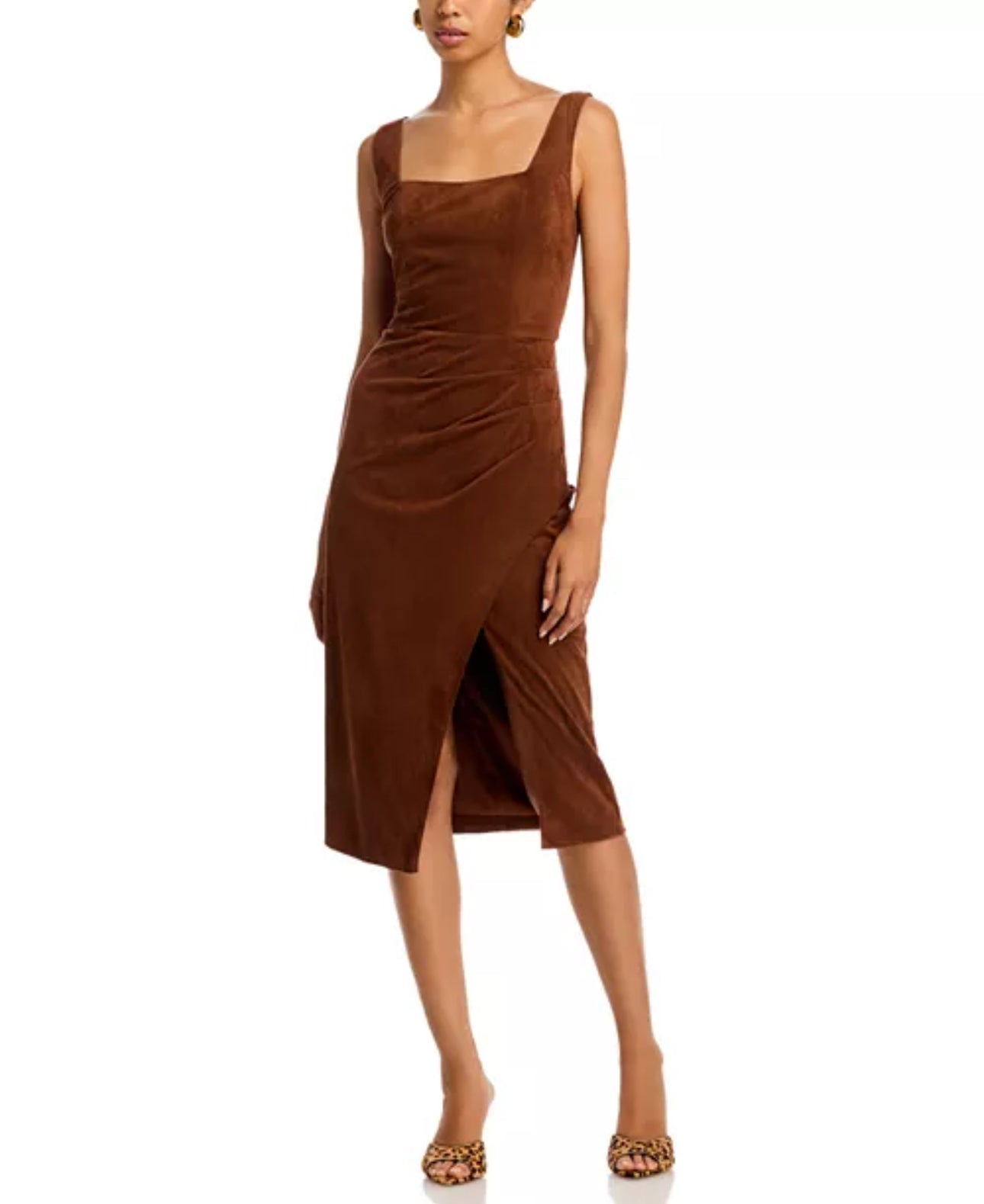 A soft, stretchy knit is ruched at the waist of this stylish sheath featuring a sultry slit at the side. Back zip closure Square neck Sleeveless 90% polyester, 10% spandex Hand wash, dry flat