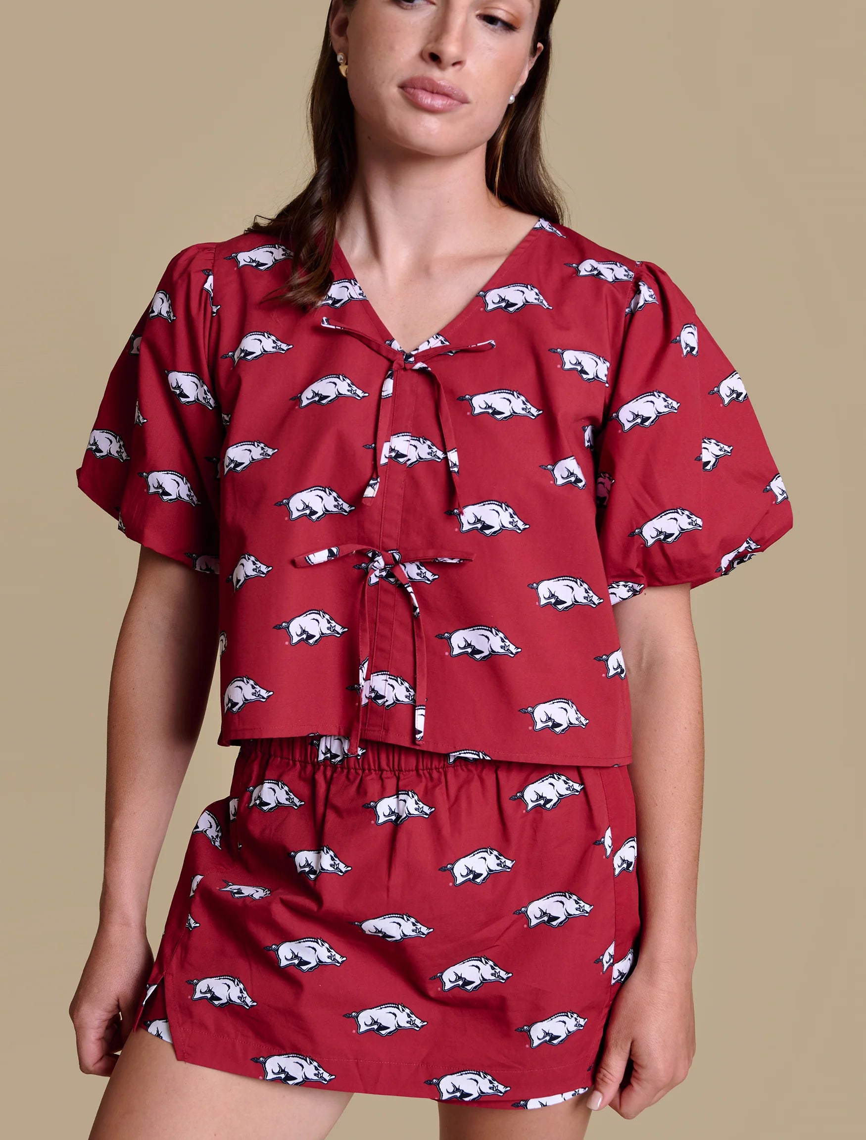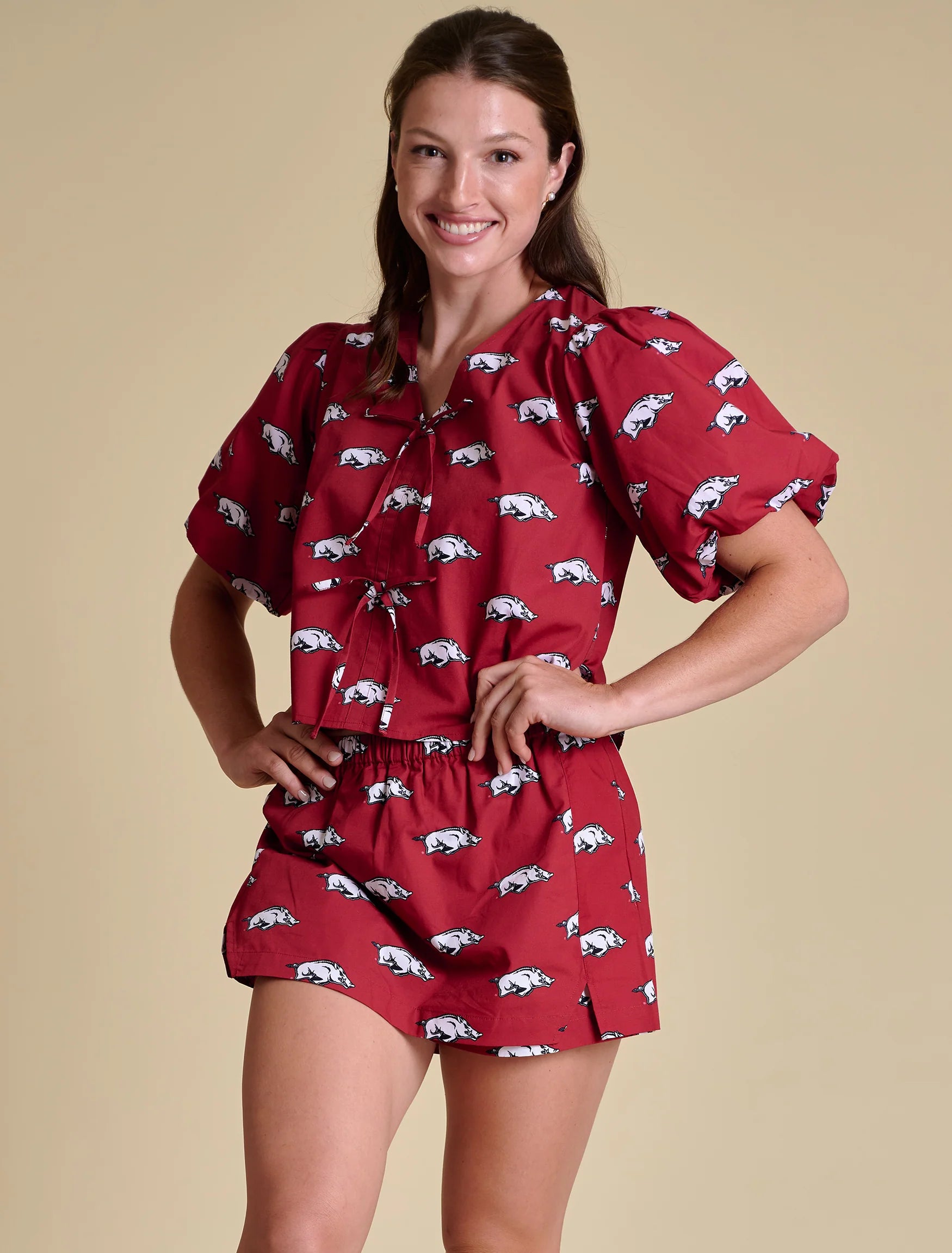 A feminine silhouette with dainty details. This puff-sleeve blouse is an effortless blend of polish and personality — with an allover offset logo print and a faux front tie that adds soft structure. Why We're Obsessed: -Feminine puff sleeves with elastic cuffs -Faux front tie detail adds shape and charm -Allover logo print for a collegiate-meets-chic look -Crisp, breathable cotton poplin Material: 100% Cotton Poplin Care: Machine wash dark colors separately. Tumble dry low. Do not bleach. Do not iron decoration. Relaxed fit Model is wearing a size S