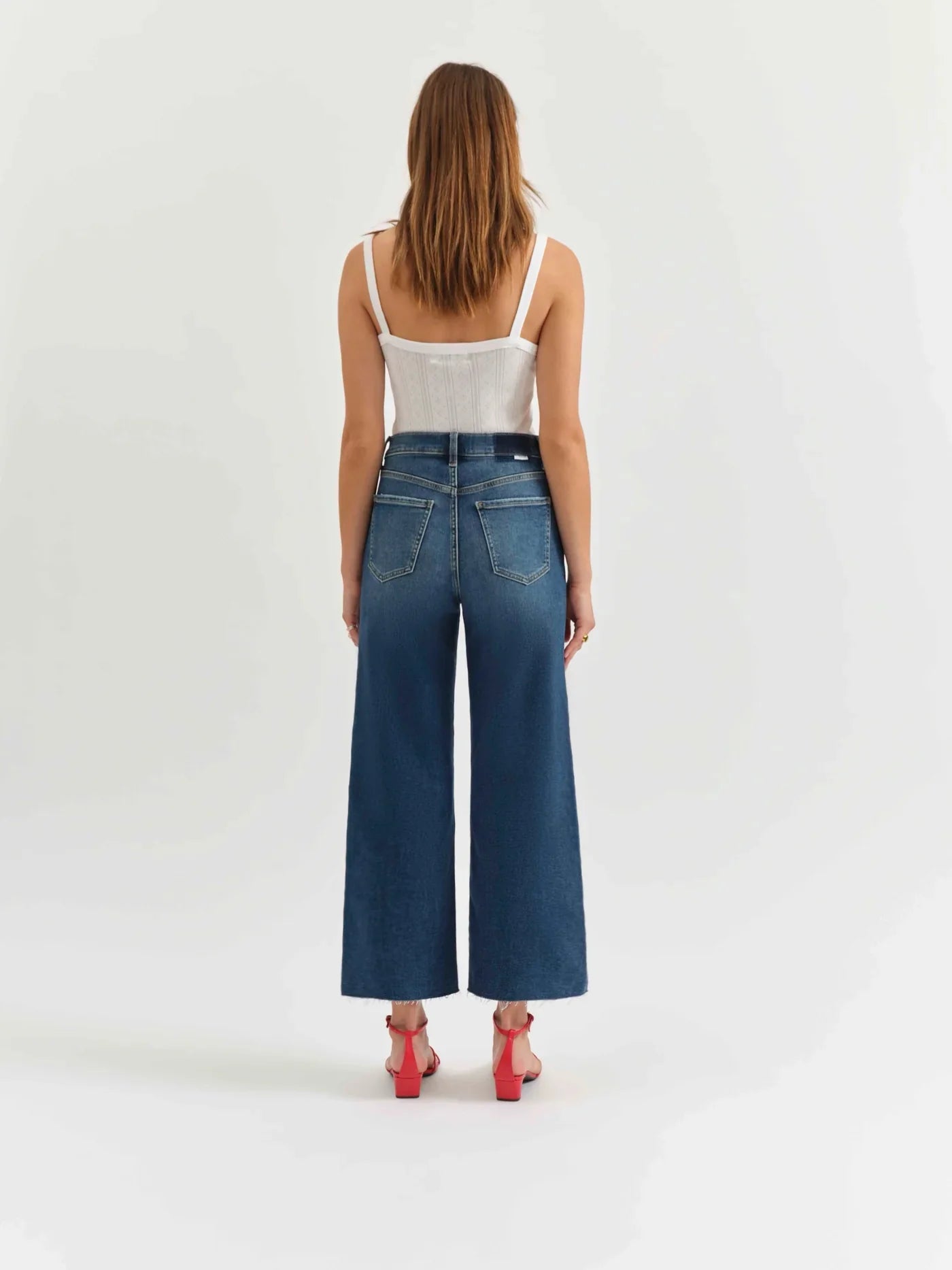 The Pleaser is our tried and true high rise wide ankle, featuring seaming details at the waist against an indigo blue wash with slight fading. This fit is constructed from our Hug denim, which is flexible enough to hug your body, yet heavy enough to cinch you in.