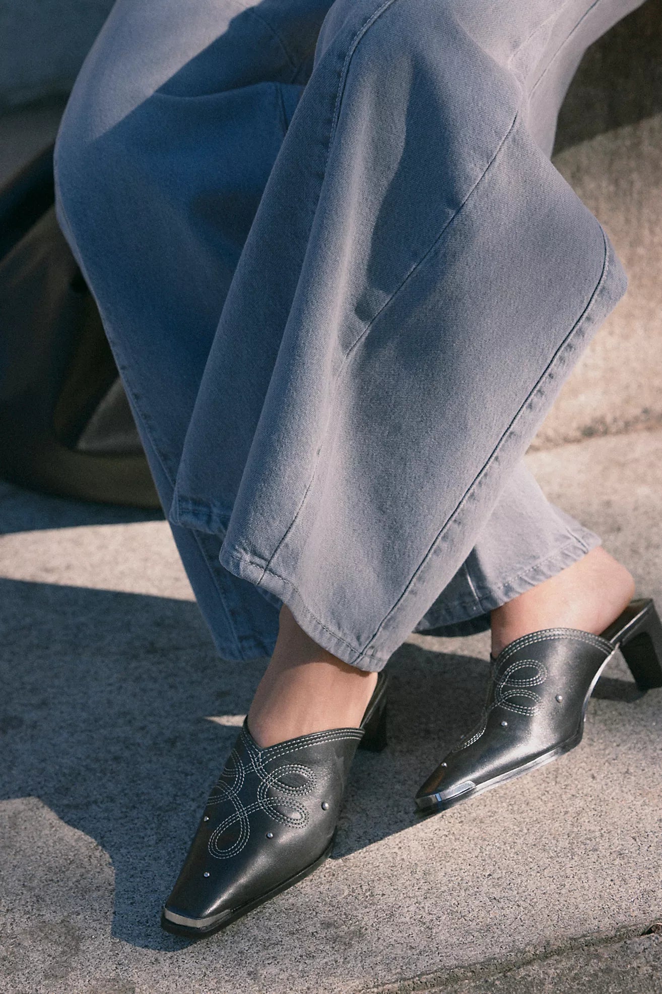 Level up every look with these cool and classic mules featured in a slide-on silhouette with a stacked heel, embossed leather fabrication, and square metal toe for a timeless western-inspired touch. Pointed top detail Thin,...