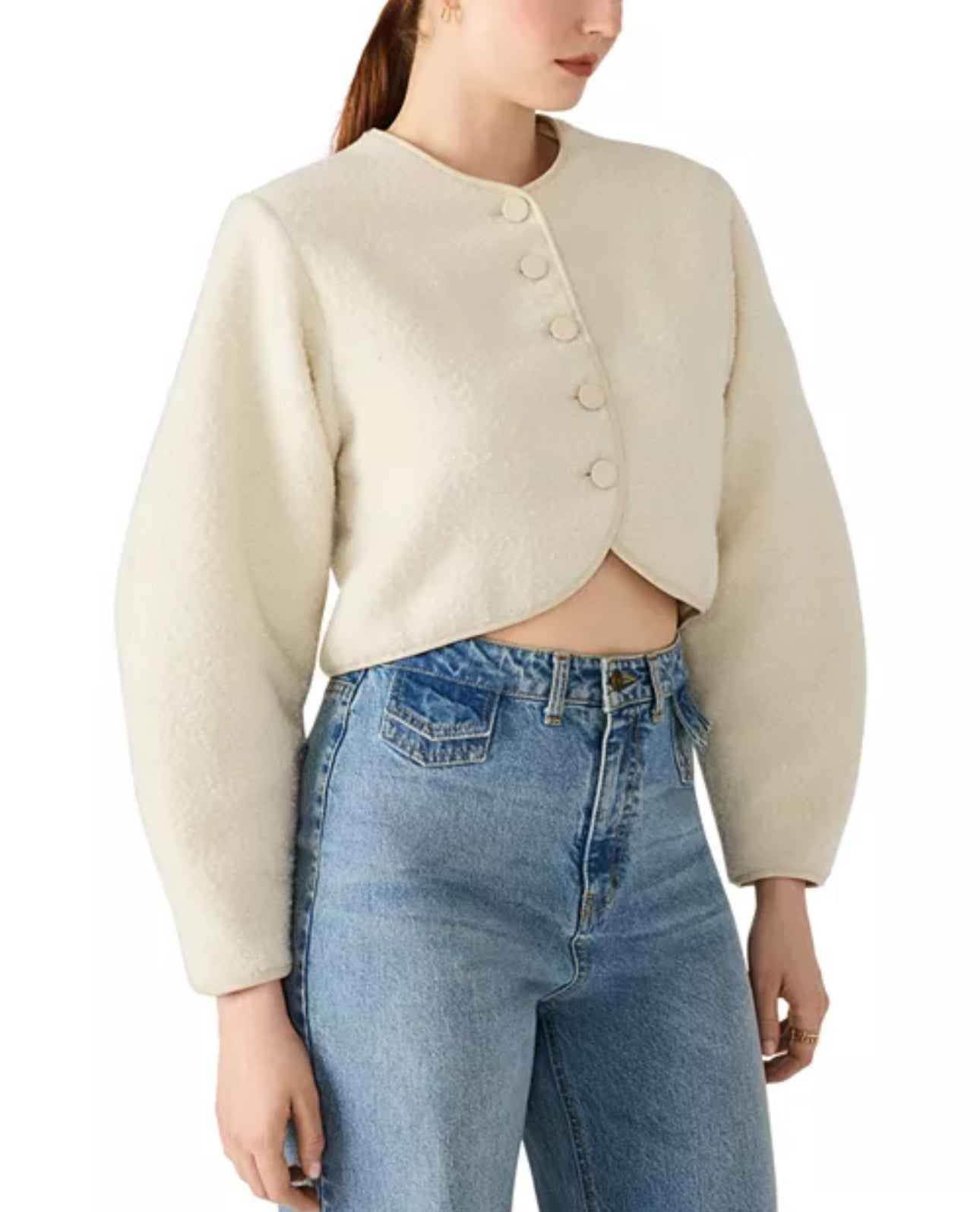 Features Collarless Long curved sleeves Front button closures Boucle fabric with faux leather trim Imported Size & Fit Fits true to size, order your normal size Model measurements: 5'10" height, 33" bust, 25" waist, 35"...