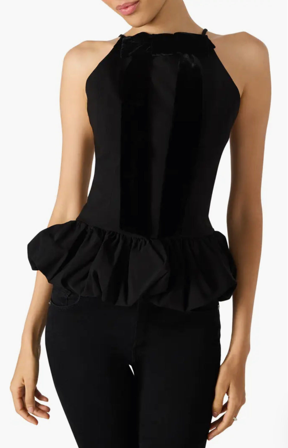 A rich velvety bow romances this figure-sculpting sleeveless top punctuated with a voluminous bubbly hem.