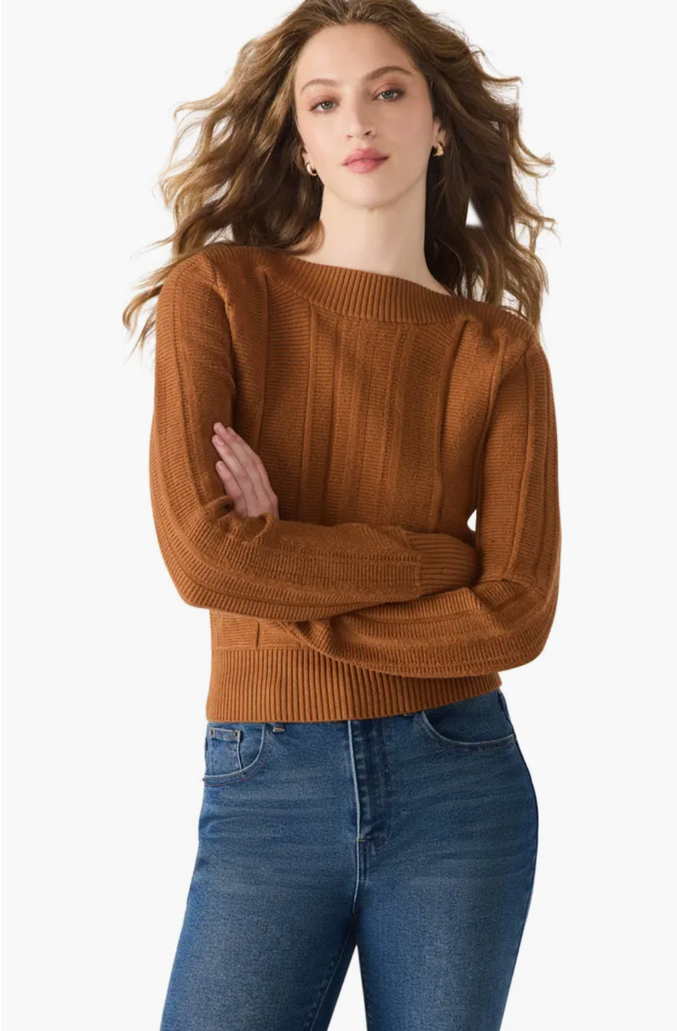 A boat neck relaxes the vibe of this chunky sweater knit with dimensional ribbing for modern texture.