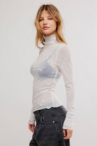 Edgy and perfect for layering, this long sleeve from Intimately features a sheer mesh fabrication, a mock neck design, and a lettuce trim for an added dimension. Sheer mesh fabrication Fitted long sleeve Mockneck design...