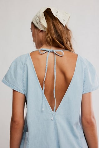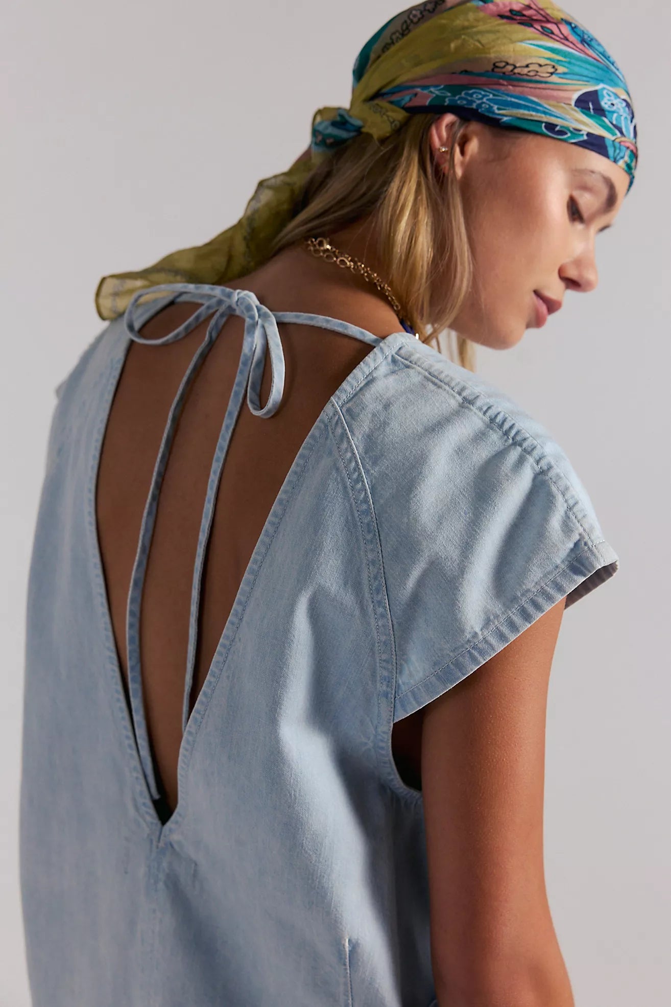 Stand out in this cool, ultra-comfortable romper, featuring an oversized fit and a shapeless silhouette with capped sleeves, wide-leg shorts, and a deep V-shaped back detail for added interest to a stunning silhouette. Lightweight denim...