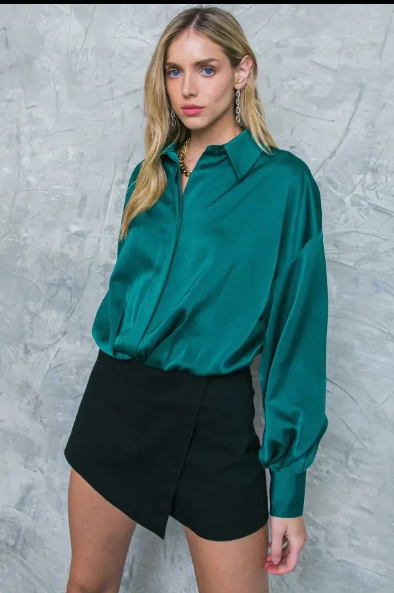 A solid woven top featuring shirt collar, hidden button down, long sleeve with cuff and elasticized waist. Matching pant IP7993